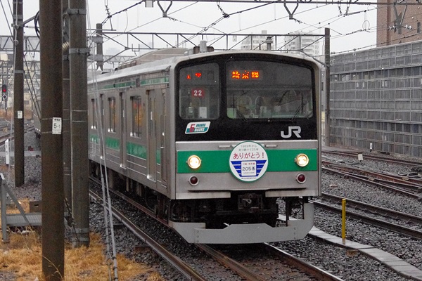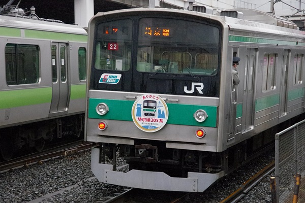 埼京線205系ハエ22編成クハ204-141です。「1989年から走り続けて25年 ありがとう!川越・埼京線205系」のヘッドマークをつけています。