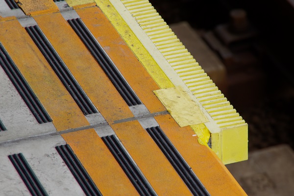 東急東横線多摩川駅。ホームと電車とのすき間を埋めるステップが設置されています。