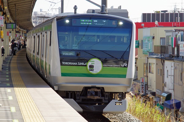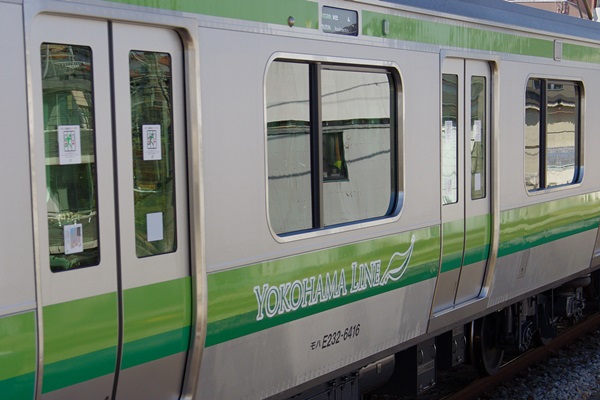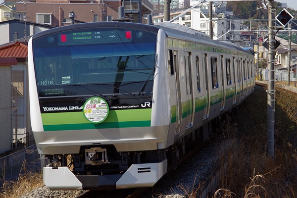 横浜線のE233系6000番台H016編成(クハE233-6016)です。正面にはYOKOHAMA LINEの文字が入りました。今は「E233 DEBUT」のヘッドマーク付きです。
