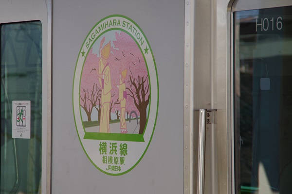運転台の後ろには駅のロゴマークが描かれていて、H016編成は相模原駅。