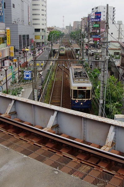 京成の町屋駅ホームから見下ろした、都電荒川線「町屋駅前」停留場です。東京メトロ千代田線の町屋駅はこの下を通っています。停留場名の「町屋駅」が京成と東京メトロのどちらを指すのかは知りません。ちなみに開業が最も古いのは都電(当時は王子電気軌道)で、停留場名は「稲荷前」→「町屋一丁目」→「町屋駅前」のように変遷しています。
