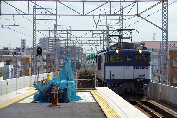 姿を現した北朝霞駅延伸ホームです(通過しているのはEF64 1010)。2両分が延伸されましたが、10両編成になるわけではなく、上下列車の停車位置を2両分ずらせて混雑を緩和するのが目的のようです。