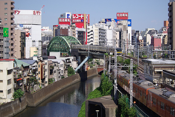聖橋から秋葉原を眺めた、おなじみの景色です。川をまたいでいるガーダー橋が総武線神田川橋梁、緑色の鉄橋が松住町架道橋です。今までとくに感じませんでしたが、陸地部分の松住町架道橋の方が立派に見えます。