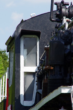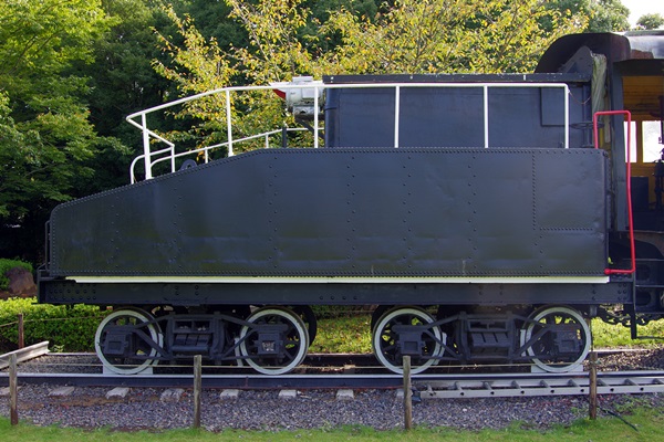 軸配置は1-C-1のプレーリーで、これが形式「PL」の由来となっています。ピストンに直結する主動輪が中央ではなく、前から3番目になっていて、何となく不自然な感じです。補修中でしょうか、脚立などが置かれています。