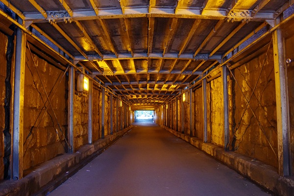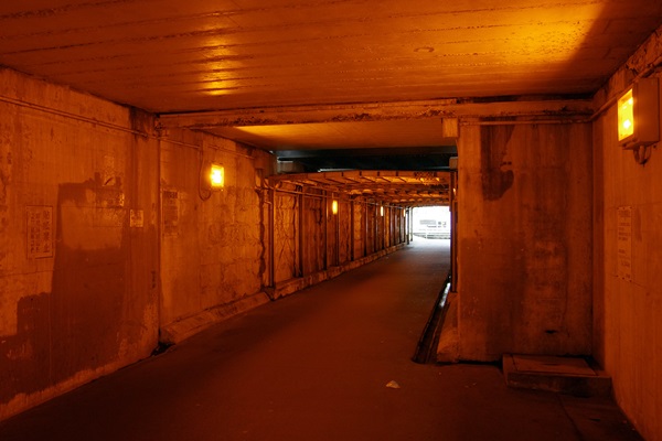 なぜかライトがナトリウムランプ。天井の崩落を防ぐためか補強の囲いがあります。