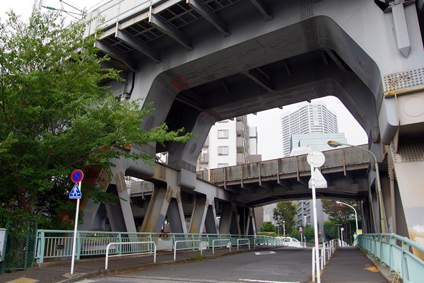 トラス橋の上に高さの違う2つの橋梁が載っているように見える橋梁群。一番下は自動車と歩行者用の芝浦橋で、この下には運河があります。奥を横切っているのが東海道貨物線(2)芝浦併用橋。一番高い橋は名称未確認で、高浜第二西運河橋梁かもしれないし、芝浦併用橋の一部なのかもしれない。