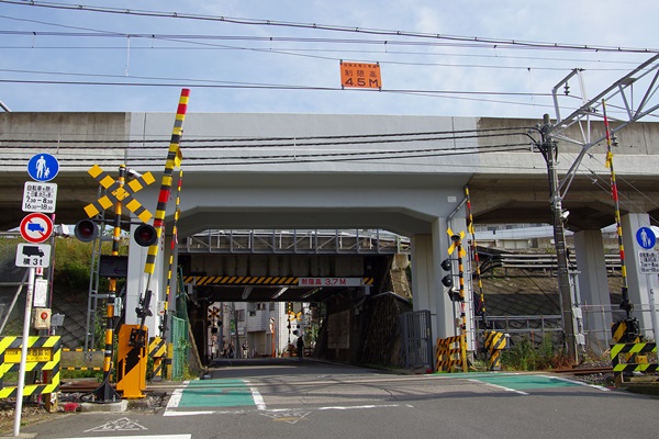 こちらは西側。奥が与美架道橋で、手間が東北回送線下り線の与美西踏切です。
