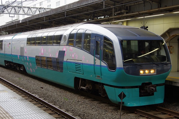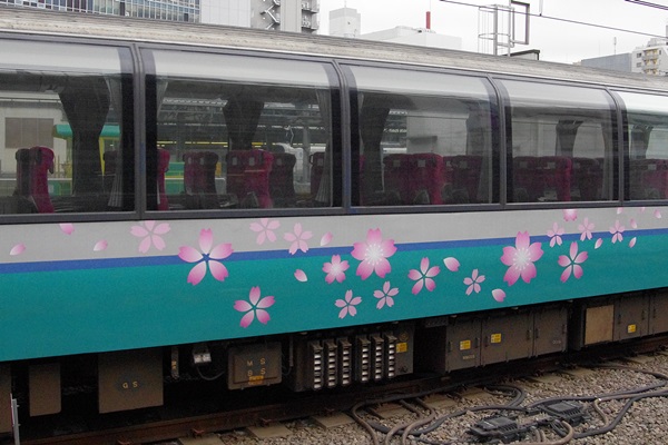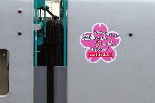 251系スーパービュー踊り子「伊豆・箱根・湯河原 温泉いっぱい花いっぱいキャンペーン」ラッピング広告車です。251系の全編成・全車両にラッピングされています。画像はクロ250-2。