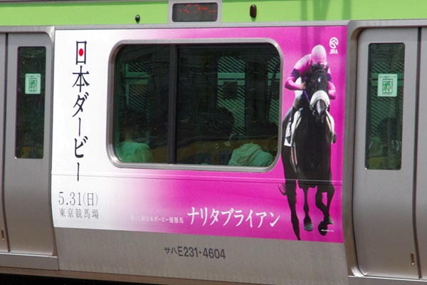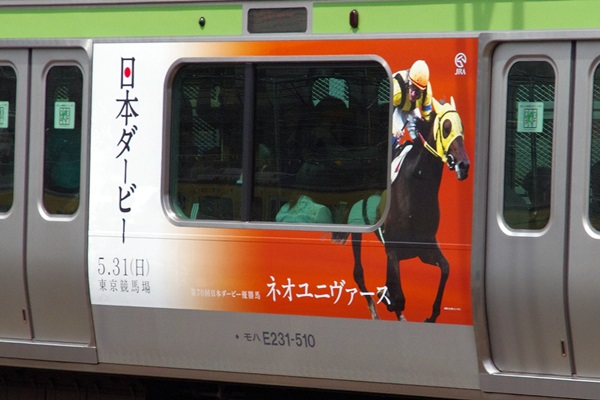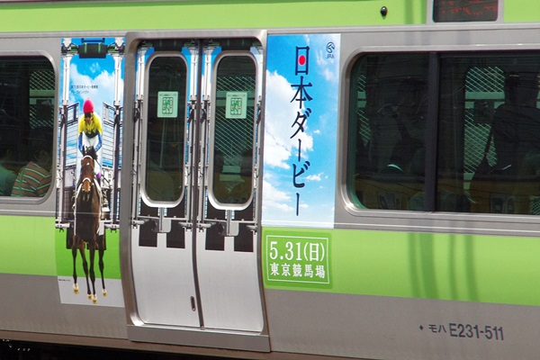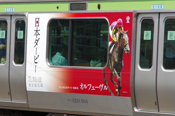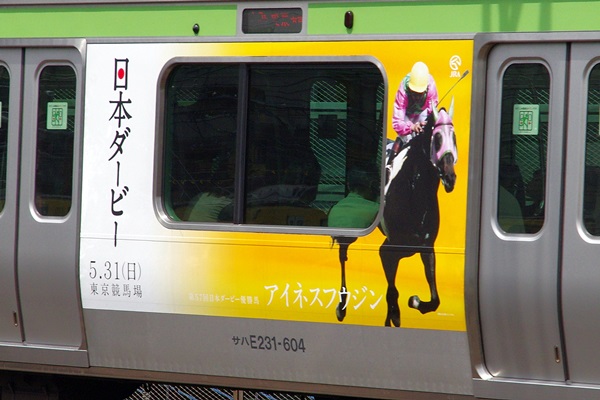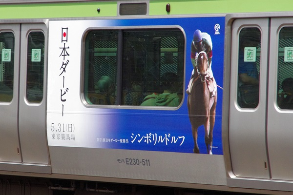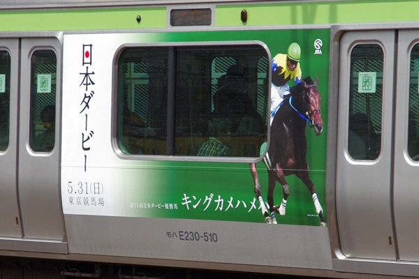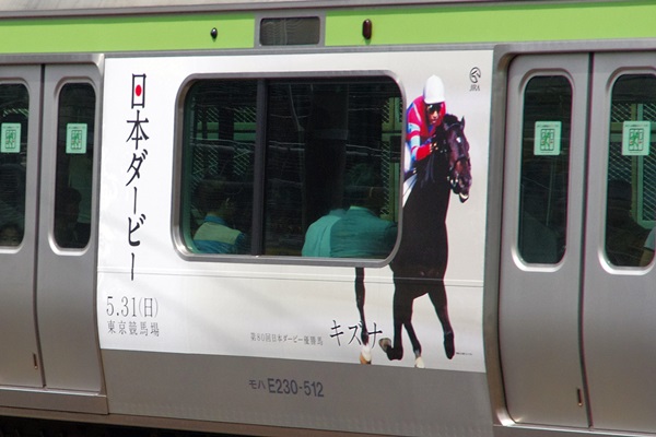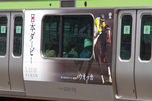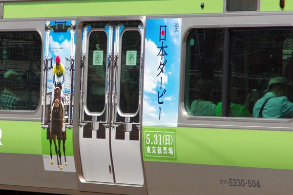 山手線504編成、JRA「日本ダービー」ラッピング広告車です。クハE230-504。
