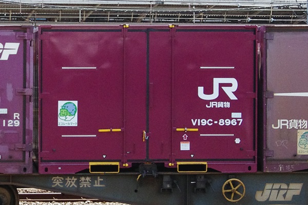 「JR貨物」表記のV19C-8967通風コンテナです。換気孔と干渉するためか、通常の「JR貨物」コンテナよりも下側に表記されています。