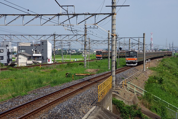 上下線が離れている武蔵野線吉川駅三郷方。この先に、かつて武蔵野操車場がありました。
