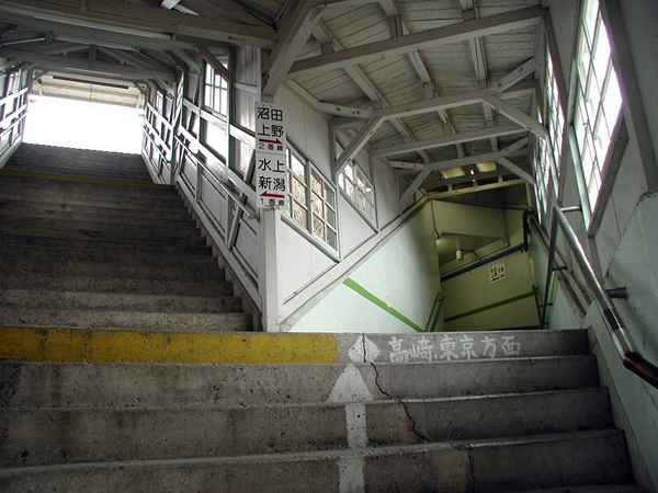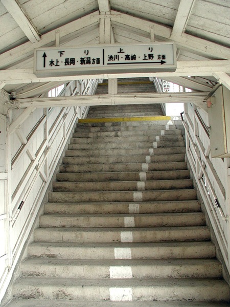 上越線上牧駅の階段です。酔っぱらいが描いたように見えるセンターラインですが、