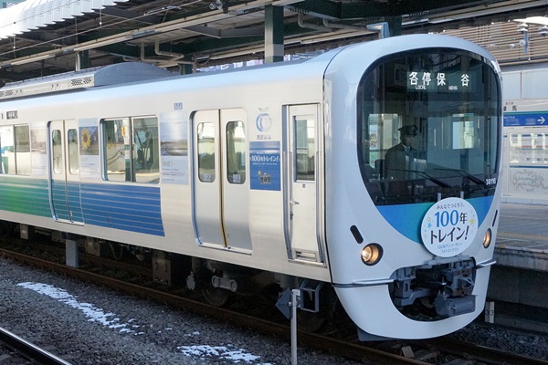 西武30000系(クハ38116)みんなでつくろう、100年トレイン! ラッピング広告車です。一般人が撮影した沿線風景が掲載されています。
