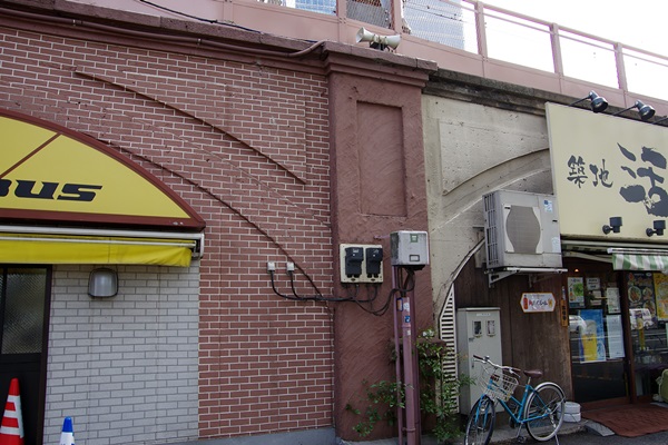 東京-有楽町間の鍛冶橋寄高架橋。レンガ積みに見える左の「はとバス」側は、実はコンクリート面にレンガ柄をプリントしただけ。