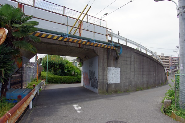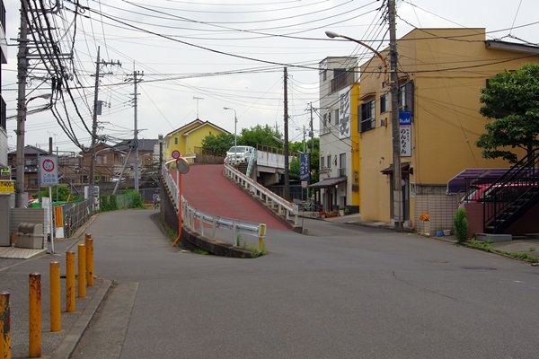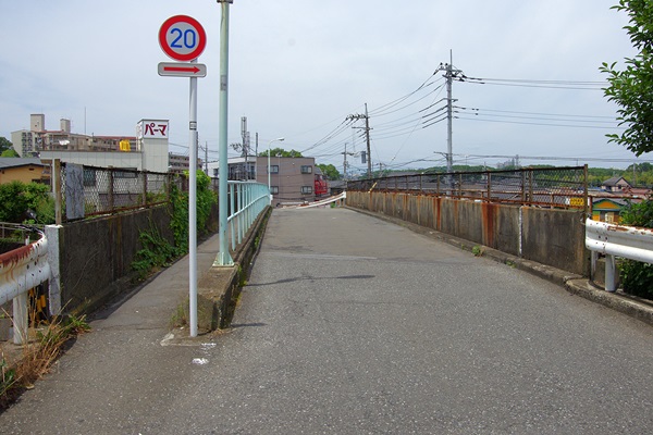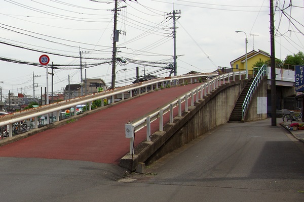 東村山市秋津町5丁目武蔵野線新秋津駅の東所沢方にある跨線橋です。道の真ん中に、跨線橋に上がるスロープがありますが、かなり細いので橋上でのすれ違いはできません。両側の道は両方とも左折し、合流してます。
