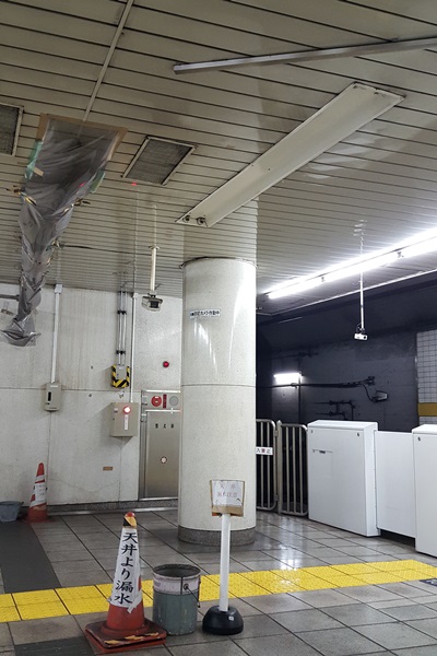 先日掲載した市ヶ谷駅の漏水。ホームの真ん中にバケツを置くのは最終手段であって、写真に示すように、多くの場合は、ビニールシートの雨どいを作って壁側に導入する。しかし、市ヶ谷駅では専用の雨どいを天井に固定して柱側に導入している。
