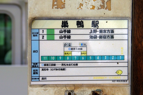 山手線巣鴨駅2番線最後尾の柱に貼り付けられている小さな案内。よく分からないのは、最下段「反対側の駅 品川」。これ、必要な情報か?