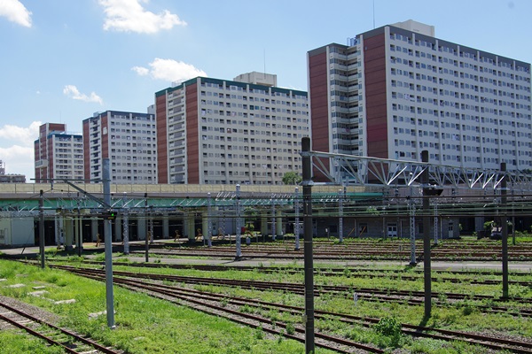 都営三田線・西台駅に隣接する志村車両検修場。ただし、車両は全く見えない。奥は都営西台アパート。高度成長期に建てられたもので、相当古い。実は留置線の上にこの団地は建てられている。現地に行くと、団地と鉄道が入り組んでいるのがよく分かる。