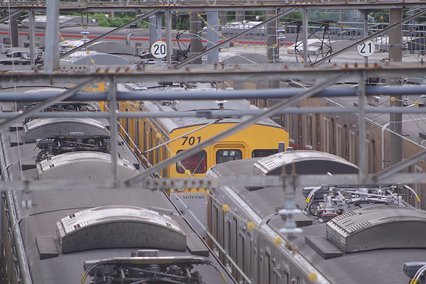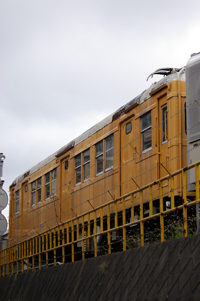 黄色の電車がモヤ701です。金網越しの撮影です。