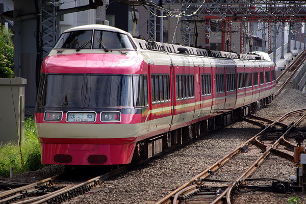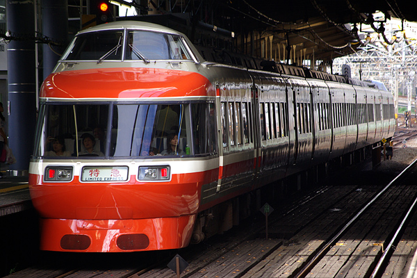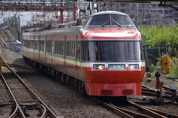ロマンスカー50周年を記念した旧塗装の7000系LSEです。先頭の字幕は「はこね」ですが、