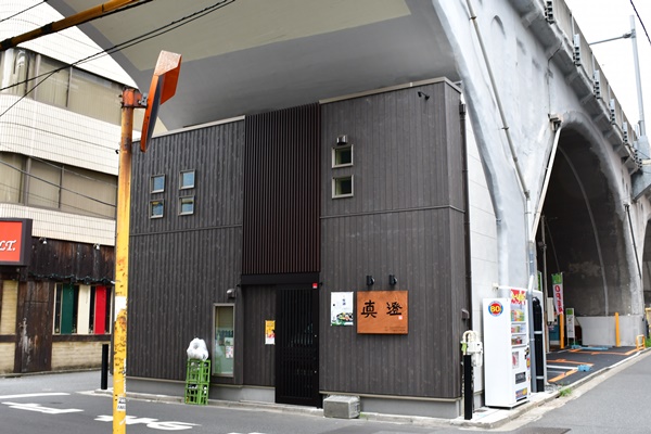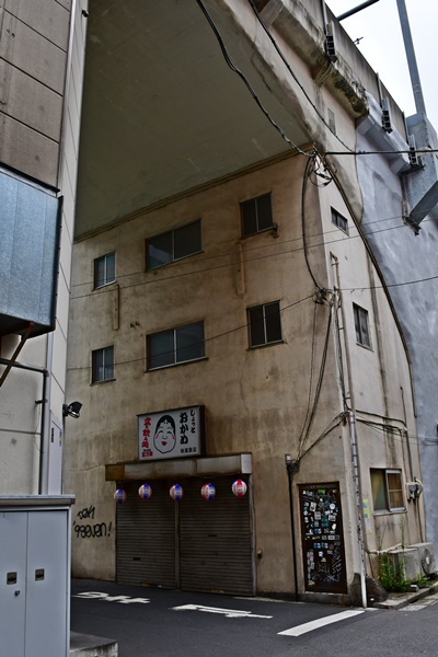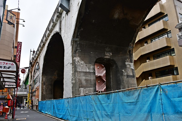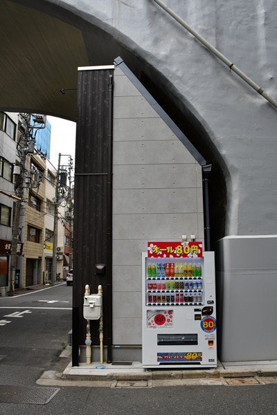 高架橋の下に公道が通る箇所があり、アーチ端の狭い土地に無理矢理ビルが建っていたりします。