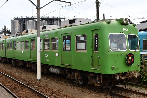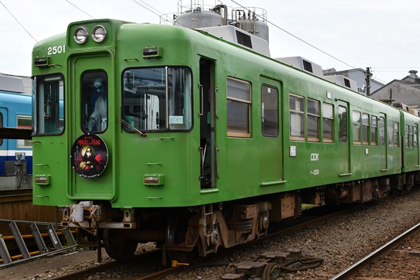 銚子電鉄デハ2001、お化け屋敷電車です。運転席にお化けが乗っています。