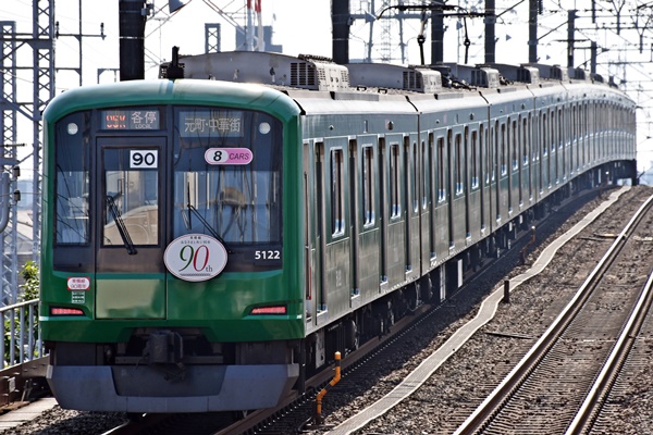 東急東横線90周年を記念したラッピング車です。もちろん青ガエルを模したラッピングです。