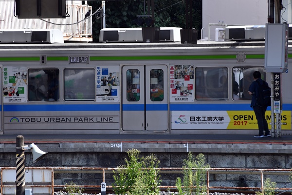 東武野田線 クハ16636、日本工業大学ラッピング広告車です。この大学は、博物館に2100形2109蒸気機関車を動態保存しています。