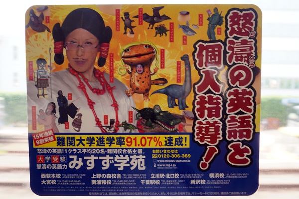 おそらく誰もがご存知の、みすず学苑の車内広告です。結構頻繁に内容が変わりますが、共通しているのは「日本武尊」が登場することです。今回はヤマトタケピコノミコトです。脳みそが爆発しきっています。