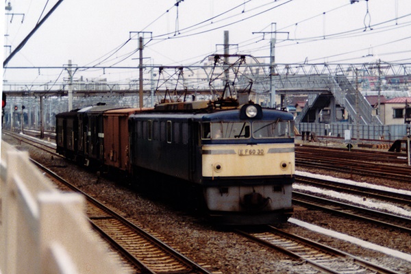 東北貨物線を走行するEF60 30号機牽引の貨物列車。車掌車が3両連結されていた。同機のナンバーはプレート型になっている。この5年後、同機は廃車になっている。
