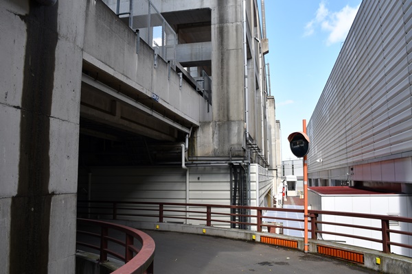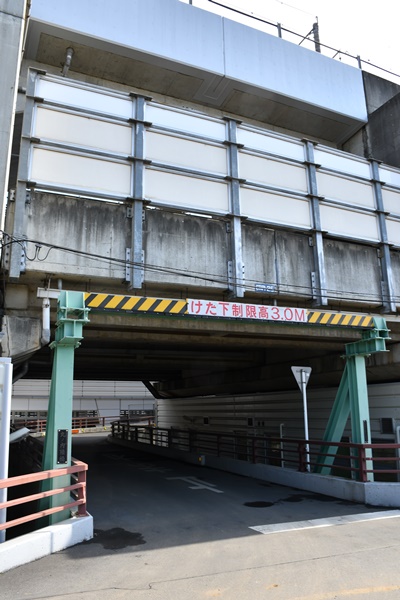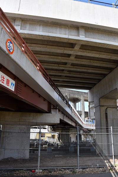 埼玉新都市交通丸山車両基地を東西に渡る丸の内陸橋です。画像は東側から見上げており、高さ制限3mの標識が付いているのが丸の内陸橋です。その上を通っているのが東北新幹線、奥に少し見えているのが上越新幹線とニューシャトルの高架です。大宮から併走していた東北新幹線と上越新幹線はこの付近で分離します。