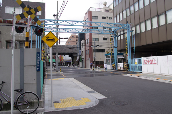 検車区側です。ビルの下をくぐって検車区に入る構造です。軌道側にも遮断機が付いています。