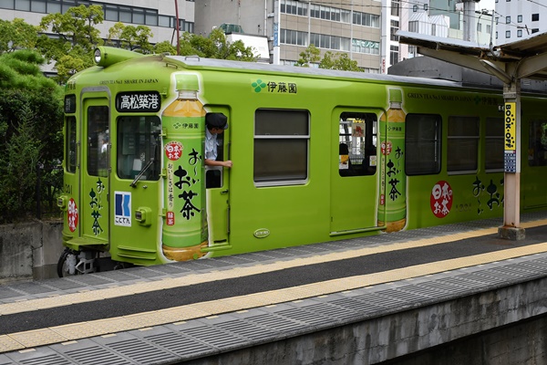 琴電 1301、伊藤園「おーいお茶」ラッピング広告車です。これはインパクトがあるラッピングです。