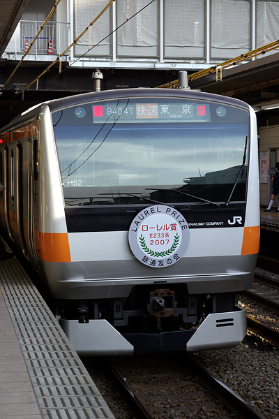 今年度の鉄道友の会ローレル賞はE233系になったようです。立川駅へ行ったら偶然授賞式に遭遇しました。画像は授賞式場の反対側(高尾方)のクハE232-52。とても立派なヘッドマークが付いています。