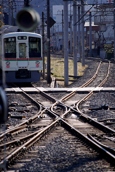 西武秩父線(左)と秩父鉄道(右)とのダブルスリップを渡る4000系。