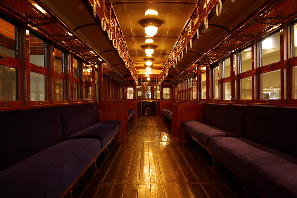 車内です。手すりがなく、ロングシートと吊革が整然と並んでいます。