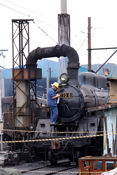 整備中の大井川鐵道C10 8。煙突から出た煙は、