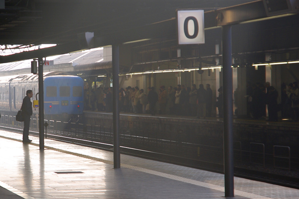 向日町に回送される「なは」。向かいの2番線の人々の大半は次の快速電車待ち。0番線側は、寝台特急なんて知ったことではないおじさんがひとり。ちなみに京都駅には1番のりばはありません。