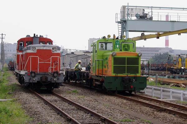 久々に越中島貨物駅へ来てみると、運良くDE10 1571が空チキを連れてきて、さらに東京レールセンター所属のモーターカーが受け取りに来ました。なんだか派手ですね。