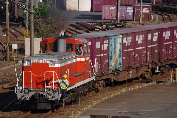新鶴見機関区川崎派出所属のDE10 1663です。隅田川でやっと捕獲しました。入れ換え機関車はあちこち渡り歩いて作業をするため、捕まえるのが難しくて。