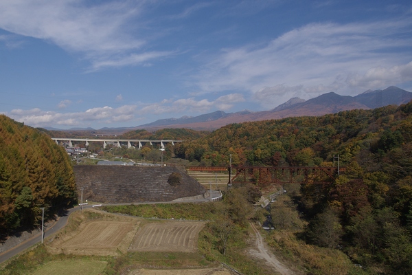 中央線信濃境-富士見間の車窓です。右奥に八ヶ岳が見えます。手前に見える鉄橋が旧立場川鉄橋の遺構です。