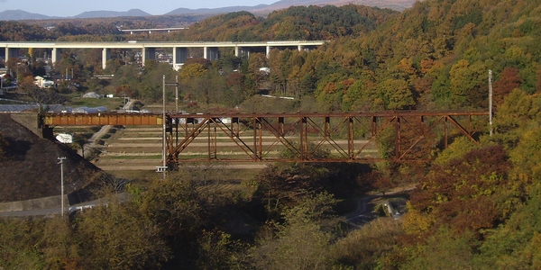 立場川鉄橋は単線となっていて、同区間の複線化により1980年に廃橋となりました。逆トラス橋の両端にはガーダー橋があります(片方は木に隠れて見えない)。背後に見えるコンクリート橋が中央高速、その後ろが八ヶ岳エコーライン(農道)です。