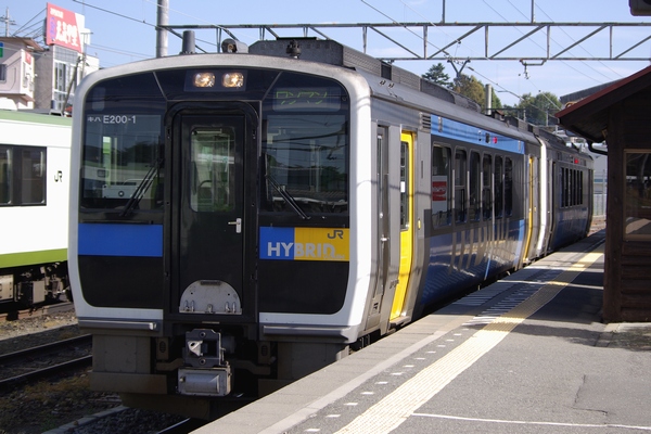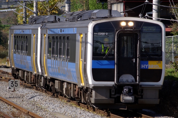キハE200-1。JR東日本のハイブリッド式気動車です。ディーゼルエンジンとリチウムイオン充電池を組み合わせモーターで駆動します。そのため走行音が一般気動車とは全く異なります。
