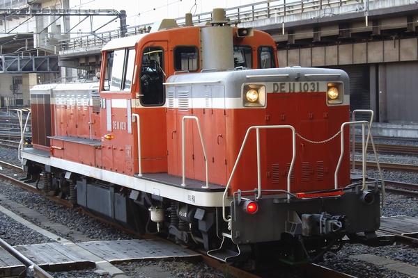 大宮総合車両センターで入れ換えをするDE11 1031です。双頭連結器(自連と密連の両方が付いている連結器)をつけています。