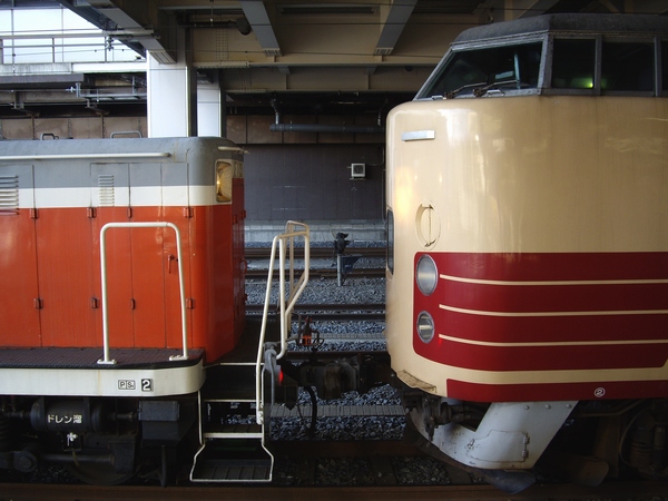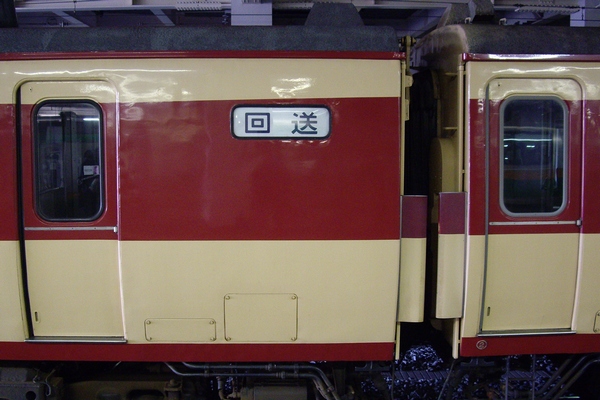 そのクハ189-508ですが、後方の窓帯上側が水平ではなく、わずかに右上がりになっています(「回送」の表示枠と比べると左側よりも右側の方が赤帯が高い)。