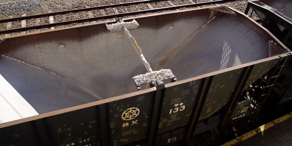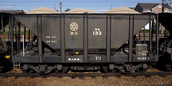 こちらは1962年汽車製のヲキ133(ヲキ100形)。石灰石を積載した状態。