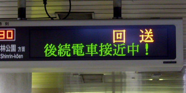 実際は「後続電車接近中!」が点滅状態になります。しかし、ビックリマークまで付けたこの表示、いったい誰に対する警告なのかよくわかりません。