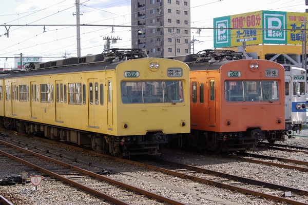 元国鉄101系の秩父鉄道デハ1011(オレンジ)とデハ1012(カナリヤ)。リバイバルカラーのこの2編成が並ぶとかつての中央線を思い出します。