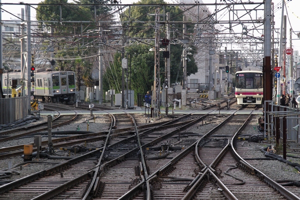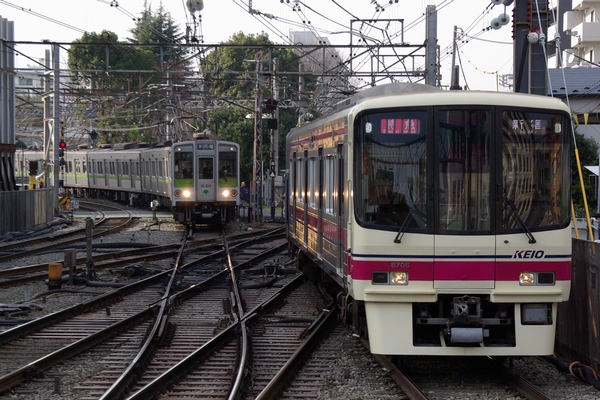 調布は京王線と相模原線の分岐駅です。右が京王線、左が相模原線。新宿行きの特急と本八幡行きの急行が同時にやってきました。