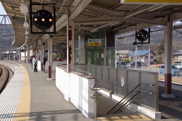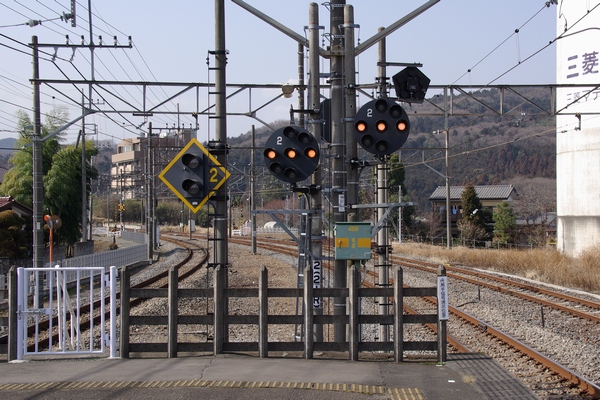 それでも見通しが悪いので、さらに中継信号機があります。左側(下り線)がこちらを向いているのは当然ですが、右側(上り線)のもこちらを向いているのは不思議ですね。これは上り線が空いている場合、下りの特急がカーブの緩い上り線を通って通過するためです。